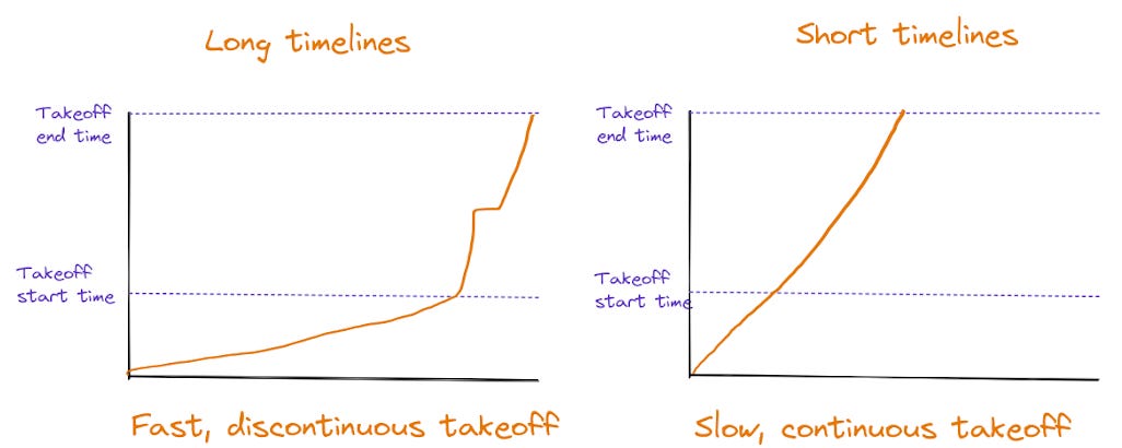 AI takeoff discussions focus on its timing, the pace of AI development and whether it'll be many small steps or a few big leaps. Here is a helpful overview by Rose Hadshar and Alex Lintz that presents 8 scenarios. I'll highlight just two for the sake of simplicity: