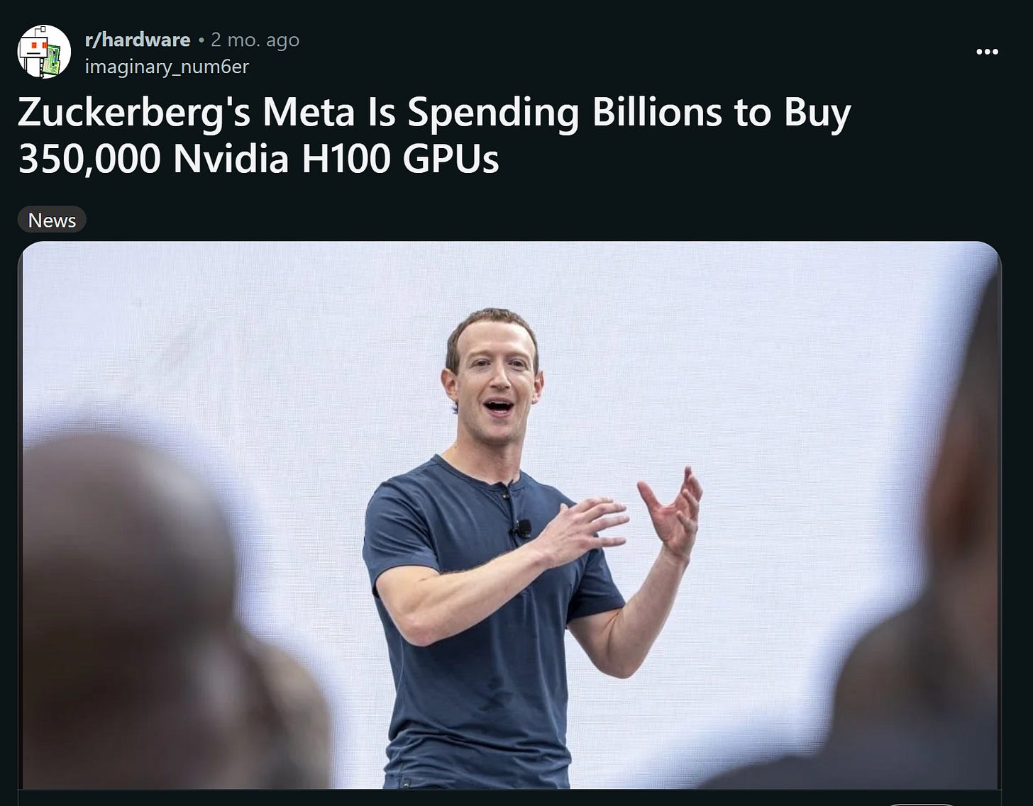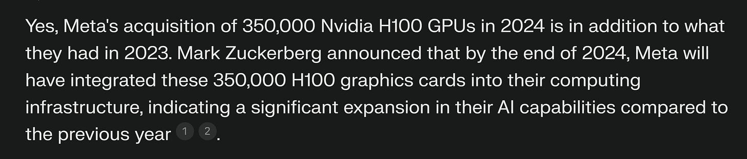 Those are the plans for 2024, and Meta probably already has ~150,000 H100 GPUs. Mark mentioned that they plan to integrate an infrastructure of 600,000 H100s by the end of the year. To understand the scale, GPT-4 was rumored to be trained on the equivalent of ~9,000 H100s. That means Meta's setup is massively larger — about 66 times bigger. And Google supposedly has even more! Of course, these are just rumors; there is no official info to confirm this.