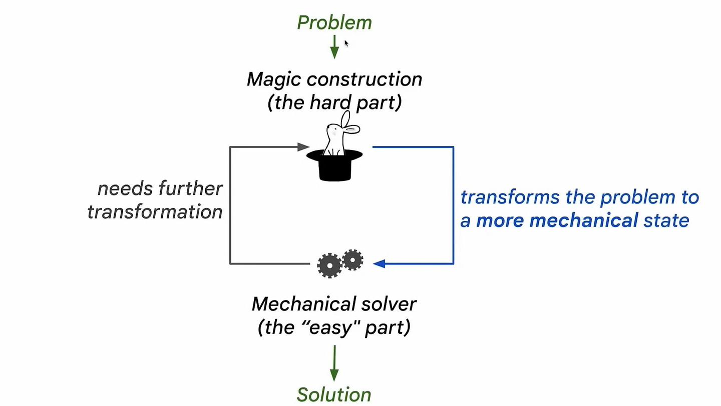In geometry, it's easier to check if your solution works than to find it. Some geometry problems are so simple that a rule-based deduction engine can solve them mechanically. But for the harder problems, you have to come up with creative ideas first. Then you turn these ideas into simpler mechanical problems that you can solve step by step. So again, the model is a combination of idea generation and validation: