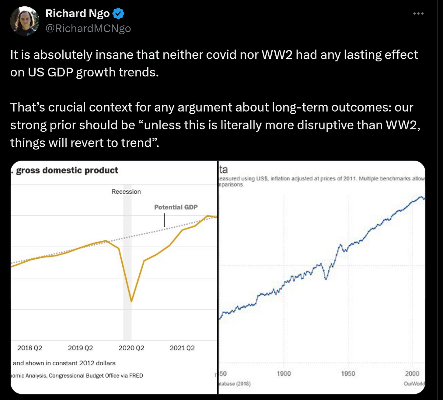 It's not that the events in Luke’s quote weren't a big deal at the time — they were. But even the worst events, like the Black Death and Genghis Khan, killed about 10% of the world's population each. But they didn't knock civilization off its positive path. World War I and the Spanish Flu combined killed 4.1%. Yet, as you can see, these were only brief disruptions, with no lasting bend in the curve. It's as if some gods of straight lines keep putting things back on track.