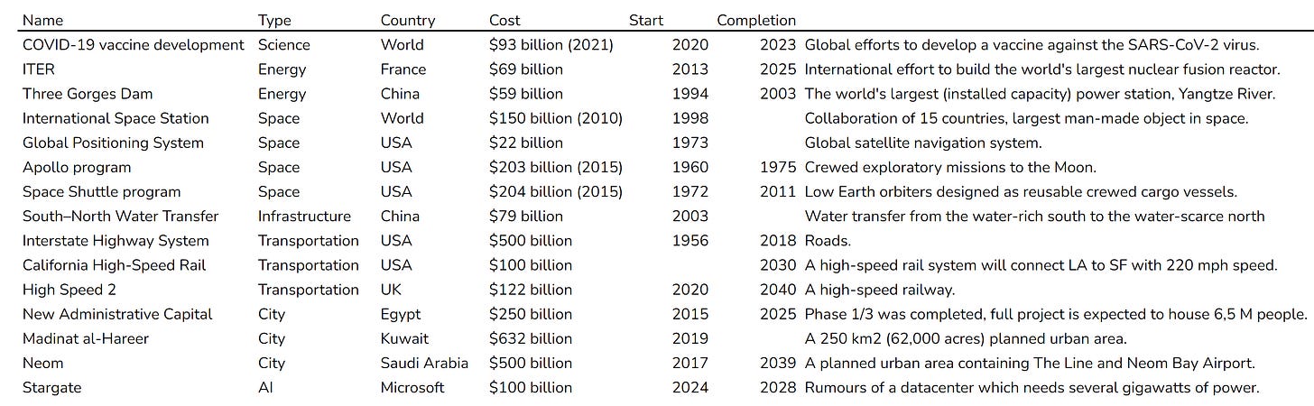 I recently heard rumors from a reliable source that Microsoft plans to invest $100 billion in its data centers. To grasp how big this number is, check out the list of Megaprojects I've picked below. (Note that I chose the ones I like; there are many more on the Wikipedia list.)