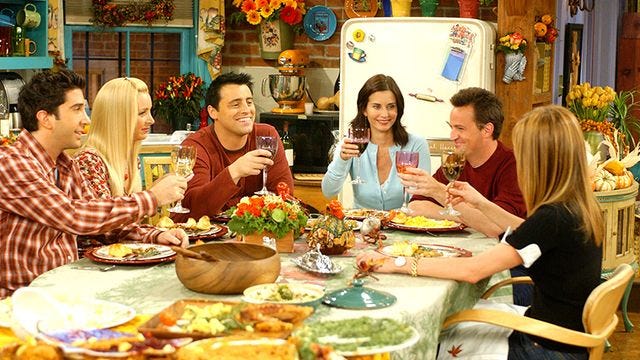 Let's begin with a fun example. Here's a screenshot from a Thanksgiving episode of the final season of "Friends," which aired about twenty years ago. I bet it doesn't look much like your dinner tables, does it? Try to count all the smartphones you see here: