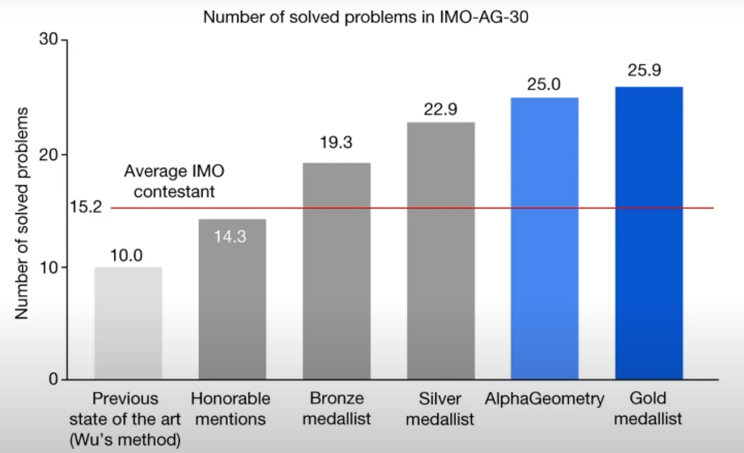 The last model I want to mention is AlphaGeometry. It scored almost perfectly in the International Mathematical Olympiad (IMO) in geometry.